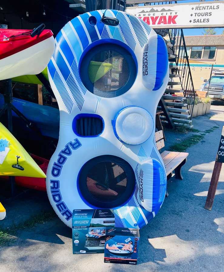 Tahoe City Kayak's retail store sells inexpensive tubes and rafts, ranging from $20 to $65 in price. We can inflate these retail tubes at our shop (for an added fee), or you can blow them up at the inflation station at the Chevron gas station across the street from the river put-in. While we have a large fleet of rental kayaks and paddleboards at our waterfront rental location at Commons Beach, we discourage our rental customers from taking our lake-oriented rentals on the river, as these kayaks are not designed for river use.